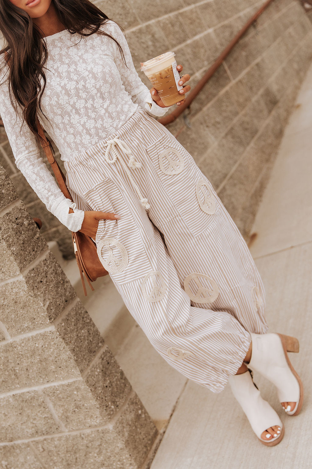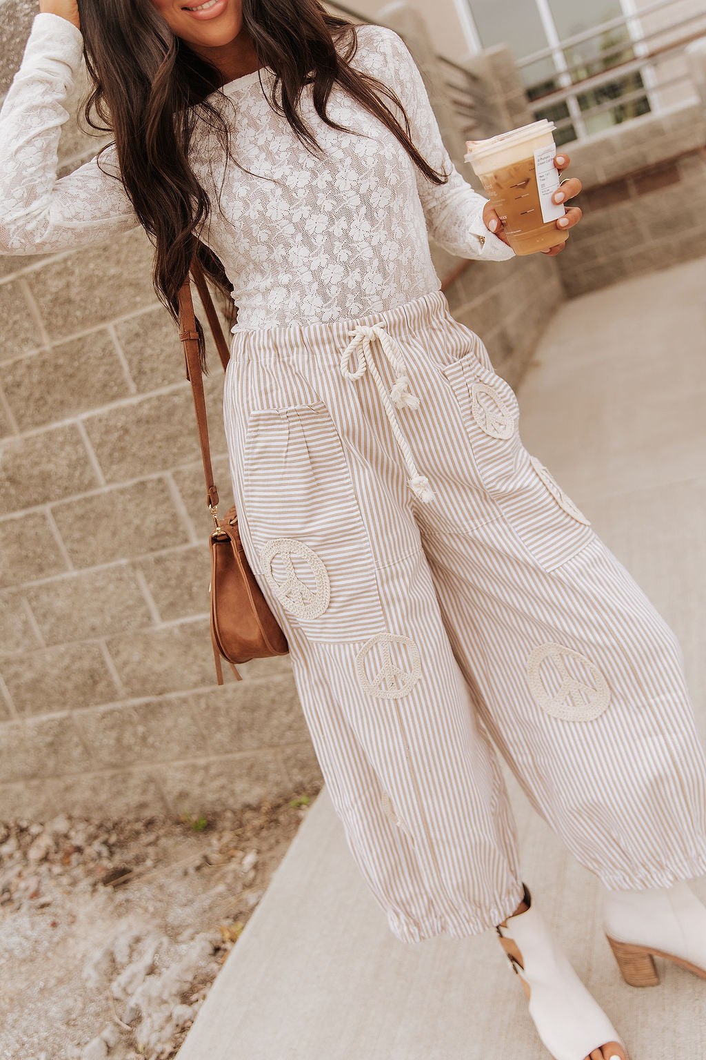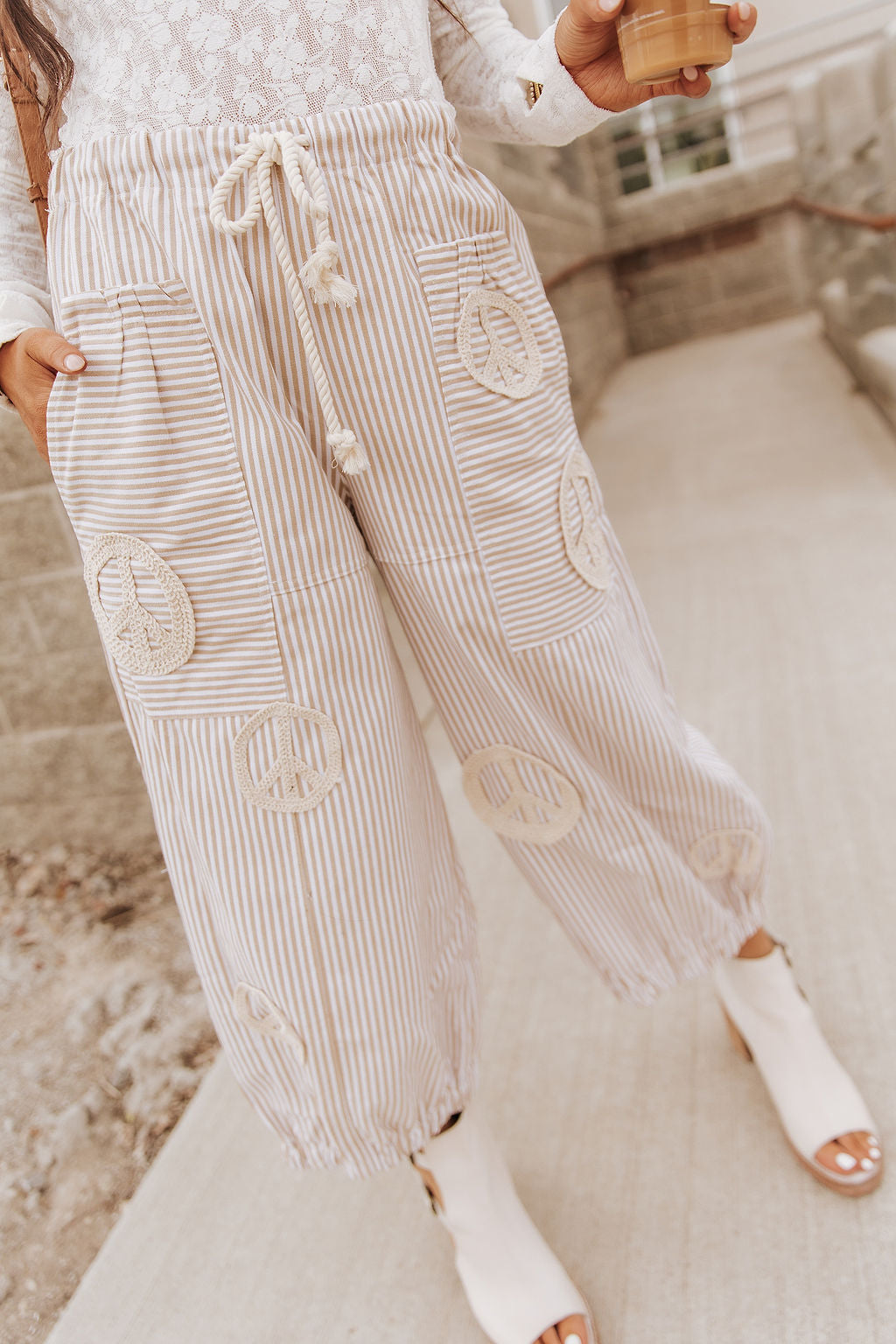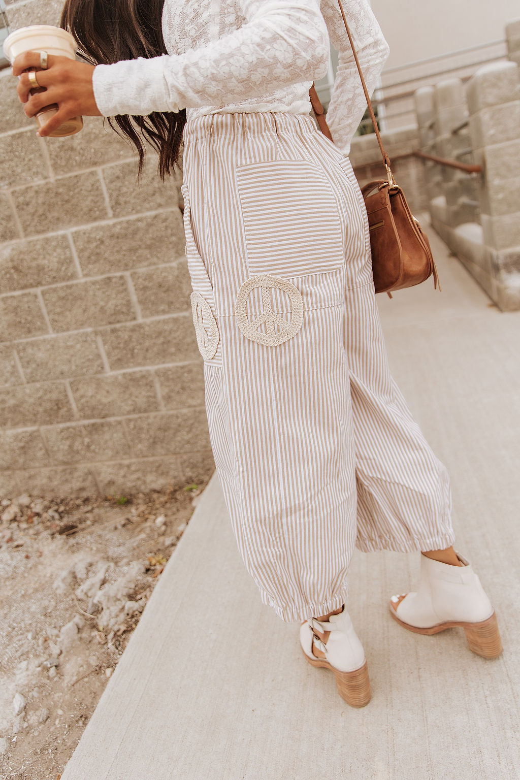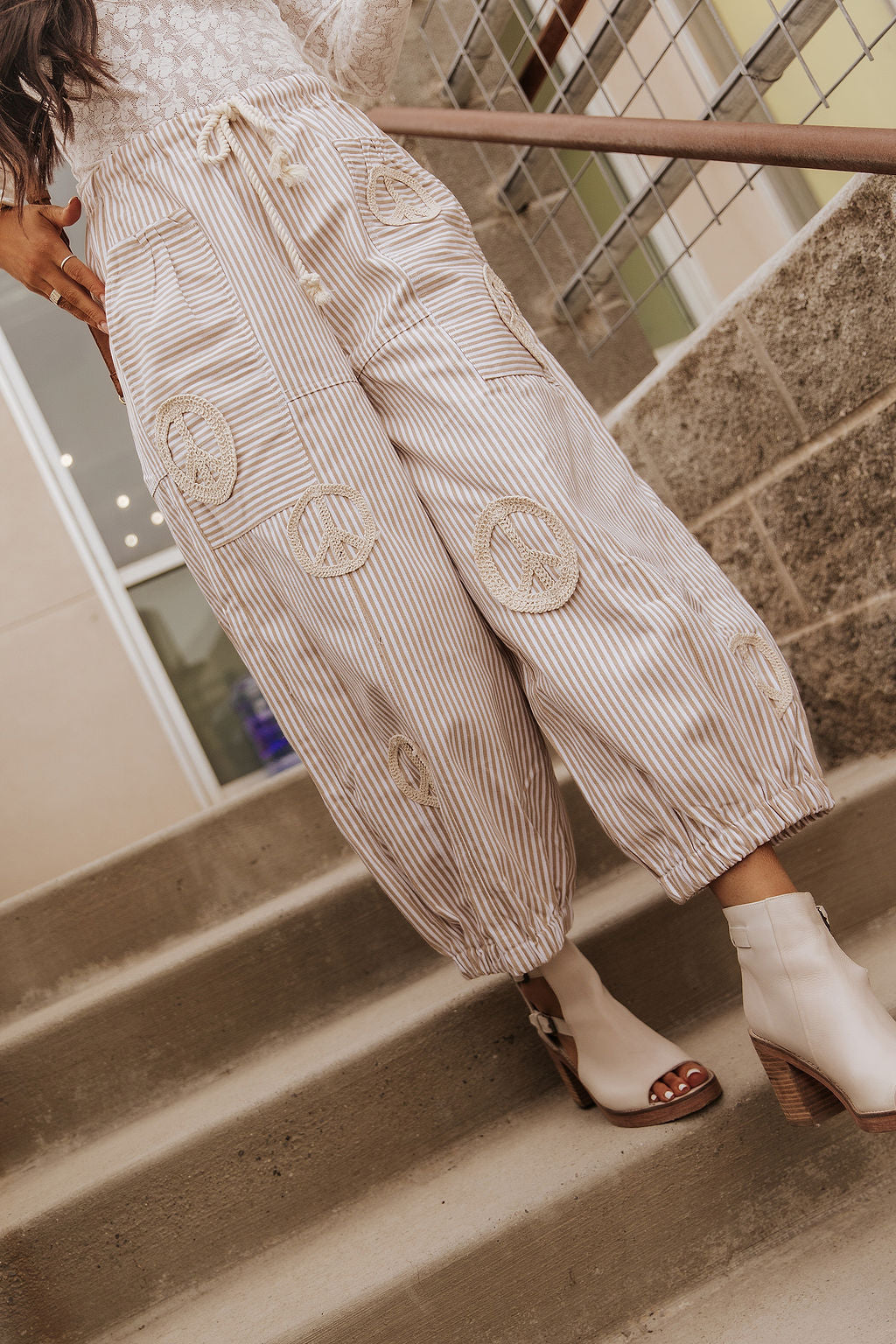 These pants are a whole vibe! ✌️ Designed with a comfy drawstring elastic waist and a wide leg relaxed fit, they’re made for chill days with standout style. The cropped length with gathered hems adds a playful shape, while the contrasting stripes bring the fun. Finished with cute appliqué peace signs for that extra touch of groovy goodness!