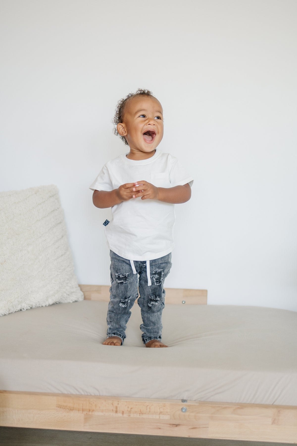The River Tee is a perfect basic top to throw on your little one for any occasion. Wear it on it's own or use it as a base layer under a jacket. The chest pocket and drop hem give it just enough flair to stand out, and the soft and stretchy fabric is perfect for your little one's skin. They're going to look extra fresh in this top.
