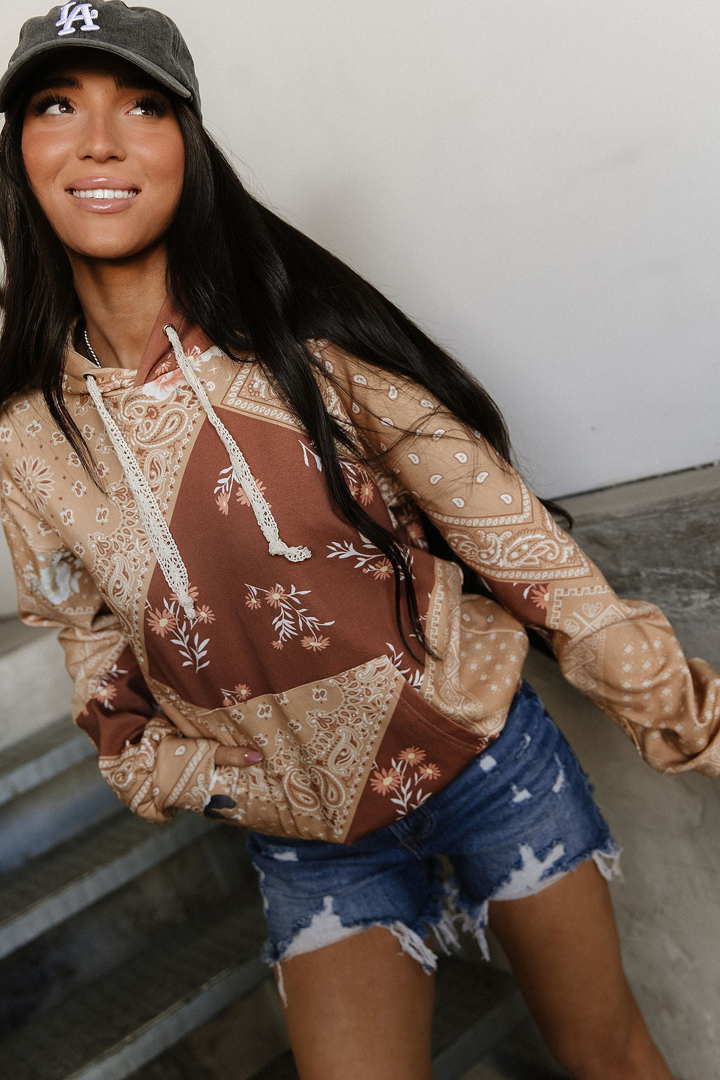 This relaxed-fit hoodie is a dreamy mix of patchwork paisley and floral prints — perfectly soft, perfectly stretchy, perfectly effortless. Designed with a laid-back silhouette and cozy feel, it’s your go-to for casual days that still call for a little style. Pair it with your favorite denim for that easy, boho-meets-cozy look you’ll wear on repeat.