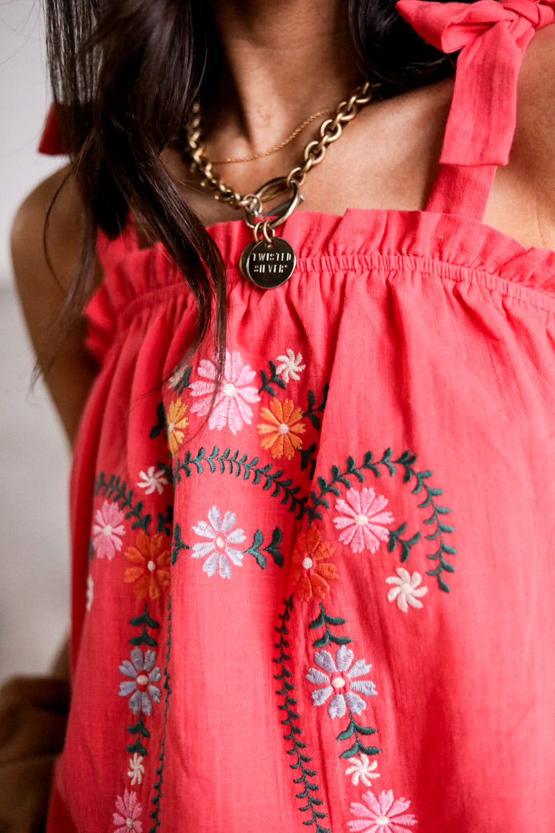 This top is sweet, flirty, and full of charm! šø It features a ruffled neckline with tie shoulder straps for a customizable, girly touch. The floral embroidery adds delicate detail, while the tassel hem gives it a playful finish. With a breezy babydoll fit, it's perfect for sunny days, weekend brunch, or just adding a little extra sweetness to your look!