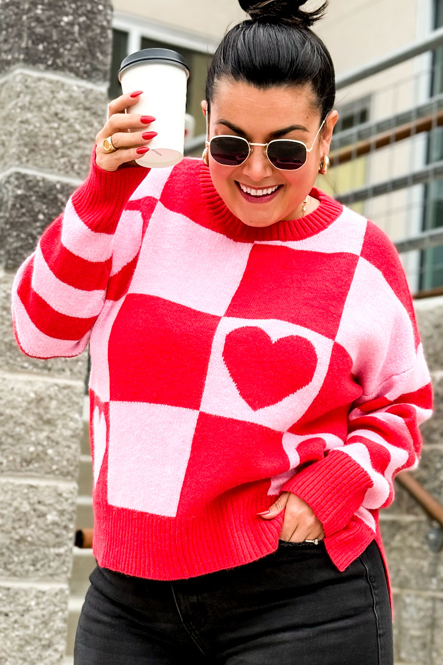 This sweater is totally charming and cozy vibes! 💕 Featuring a classic crew neckline and fun long striped sleeves, it’s all about mixing prints in the best way. The bold colorblock design blends pink and red checkered patterns with adorable hearts, making it the ultimate feel-good piece. With a soft knit fabric, relaxed fit, and side slit high-low hem, it’s perfect for adding a little love to your look - no matter the season!