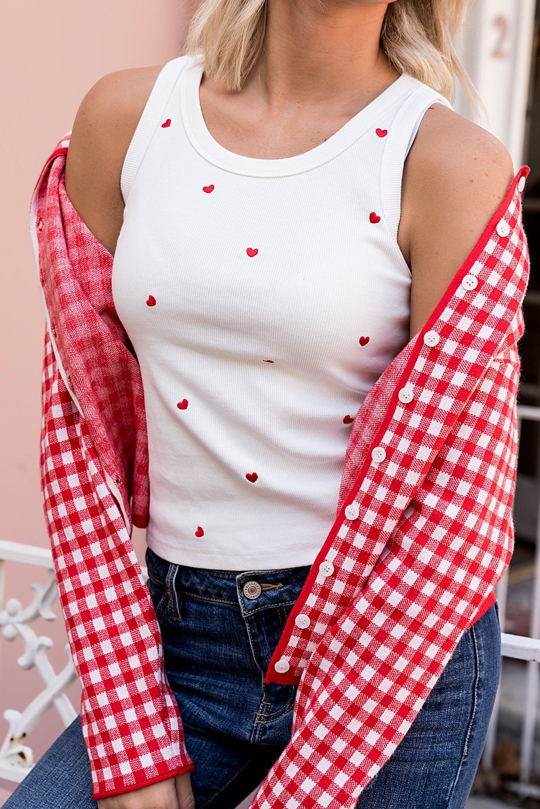 This ribbed tank top is the perfect mix of cute and charming. Tiny embroidered hearts scattered all over add a playful, flirty touch, while the soft ribbed fabric hugs comfortably for an easy, flattering fit. Layer it under your favorite cardigan, hoodie, or wear it on its own for a look that’s effortlessly sweet and endlessly wearable.
