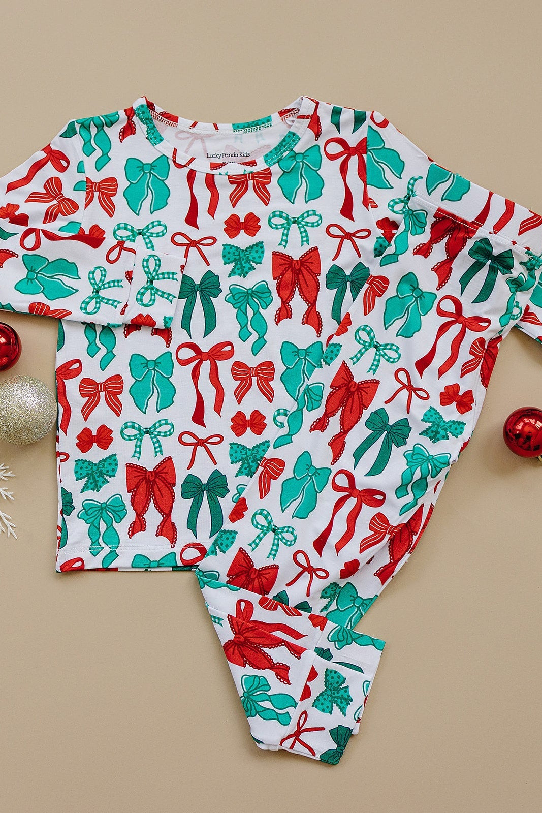 The Bamboo Two Piece Set | Merry Bows is wrapped in holiday spirit with bright red and green bows from head to toe.