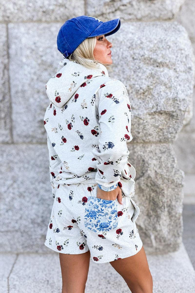 Floral in red, white & blue! Did you see that contrast pocket?! Complete the look with our matching University Hoodie.
